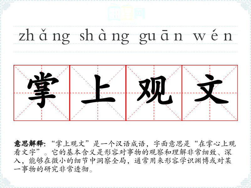 “掌上观文”是一个汉语成语,字面意思是“在掌心上观看文字”。它的基本含义是形容对事物的观察和理解非常细致、深入,能够在微小的细节中洞察全局,通常用来形容学识渊博或对某一事物的研究非常透彻。