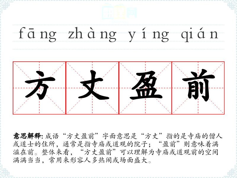 成语“方丈盈前”字面意思是“方丈”指的是寺庙的僧人或道士的住所,通常是指寺庙或道观的院子;“盈前”则意味着满溢在前。整体来看,“方丈盈前”可以理解为寺庙或道观前的空间满满当当,常用来形容人多热闹或场面盛大。