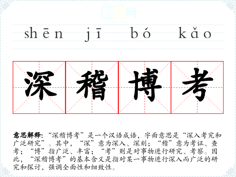 “深稽博考”是一个汉语成语,字面意思是“深入考究和广泛研究”。其中,“深”意为深入、深刻;“稽”意为考证、查考;“博”指广泛、丰富;“考”则是对事物进行研究、考察。因此,“深稽博考”的基本含义是指对某一事物进行深入而广泛的研究和探讨,强调全面性和细致性。