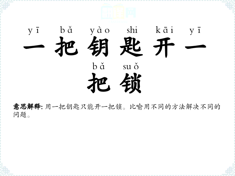 用一把钥匙只能开一把锁。比喻用不同的方法解决不同的问题。 |