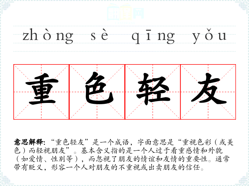 “重色轻友”是一个成语,字面意思是“重视色彩(或美色)而轻视朋友”。基本含义指的是一个人过于看重感情和外貌(如爱情、性别等),而忽视了朋友的情谊和友情的重要性。通常带有贬义,形容一个人对朋友的不重视或出卖朋友的信任。