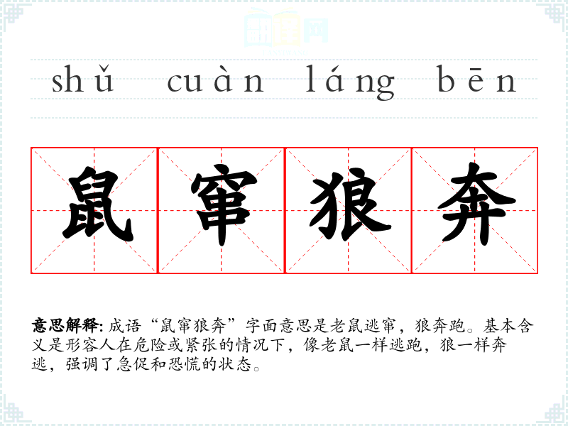 成语“鼠窜狼奔”字面意思是老鼠逃窜,狼奔跑。基本含义是形容人在危险或紧张的情况下,像老鼠一样逃跑,狼一样奔逃,强调了急促和恐慌的状态。