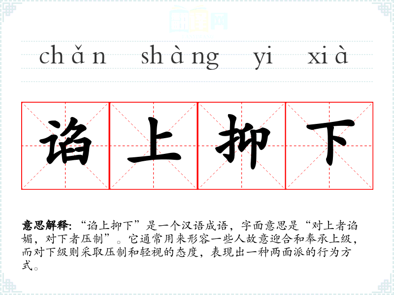 “谄上抑下”是一个汉语成语,字面意思是“对上者谄媚,对下者压制”。它通常用来形容一些人故意迎合和奉承上级,而对下级则采取压制和轻视的态度,表现出一种两面派的行为方式。