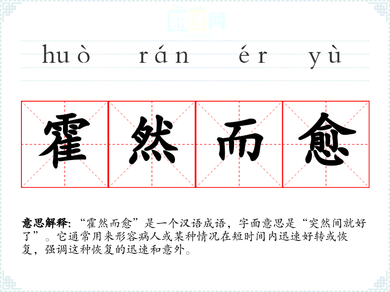 “霍然而愈”是一个汉语成语,字面意思是“突然间就好了”。它通常用来形容病人或某种情况在短时间内迅速好转或恢复,强调这种恢复的迅速和意外。