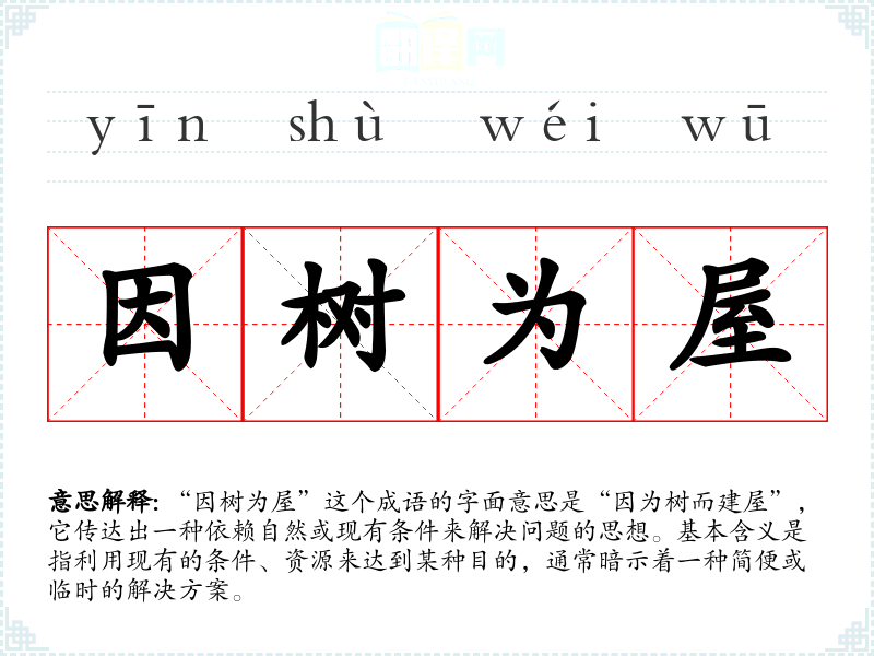 “因树为屋”这个成语的字面意思是“因为树而建屋”,它传达出一种依赖自然或现有条件来解决问题的思想。基本含义是指利用现有的条件、资源来达到某种目的,通常暗示着一种简便或临时的解决方案。