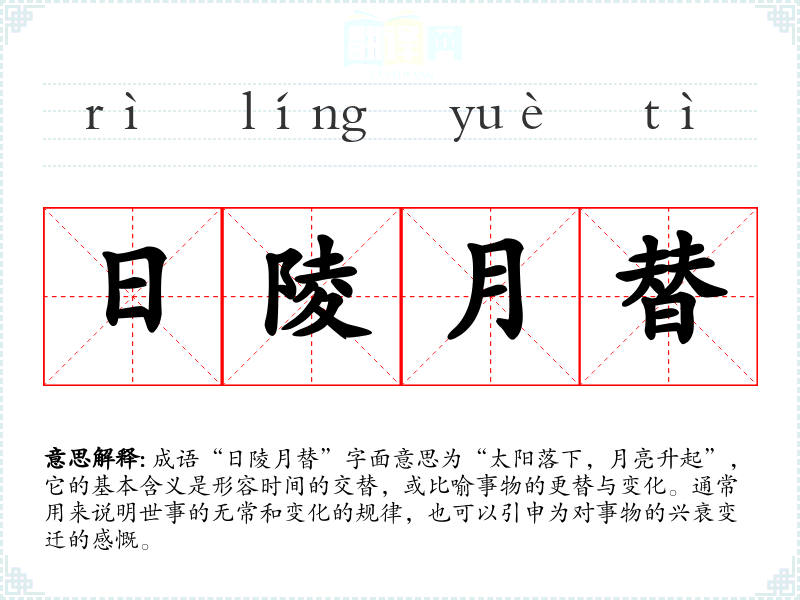 成语“日陵月替”字面意思为“太阳落下,月亮升起”,它的基本含义是形容时间的交替,或比喻事物的更替与变化。通常用来说明世事的无常和变化的规律,也可以引申为对事物的兴衰变迁的感慨。