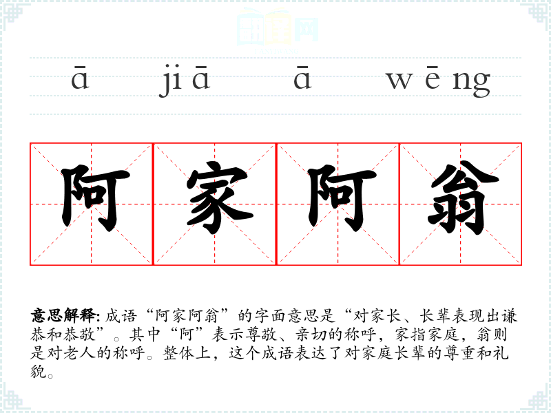 成语“阿家阿翁”的字面意思是“对家长、长辈表现出谦恭和恭敬”。其中“阿”表示尊敬、亲切的称呼,家指家庭,翁则是对老人的称呼。整体上,这个成语表达了对家庭长辈的尊重和礼貌。