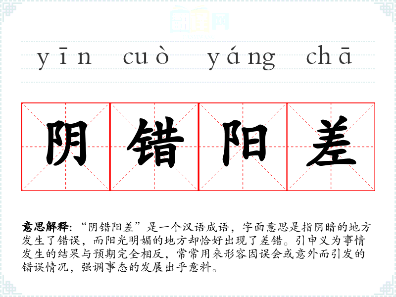 “阴错阳差”是一个汉语成语,字面意思是指阴暗的地方发生了错误,而阳光明媚的地方却恰好出现了差错。引申义为事情发生的结果与预期完全相反,常常用来形容因误会或意外而引发的错误情况,强调事态的发展出乎意料。