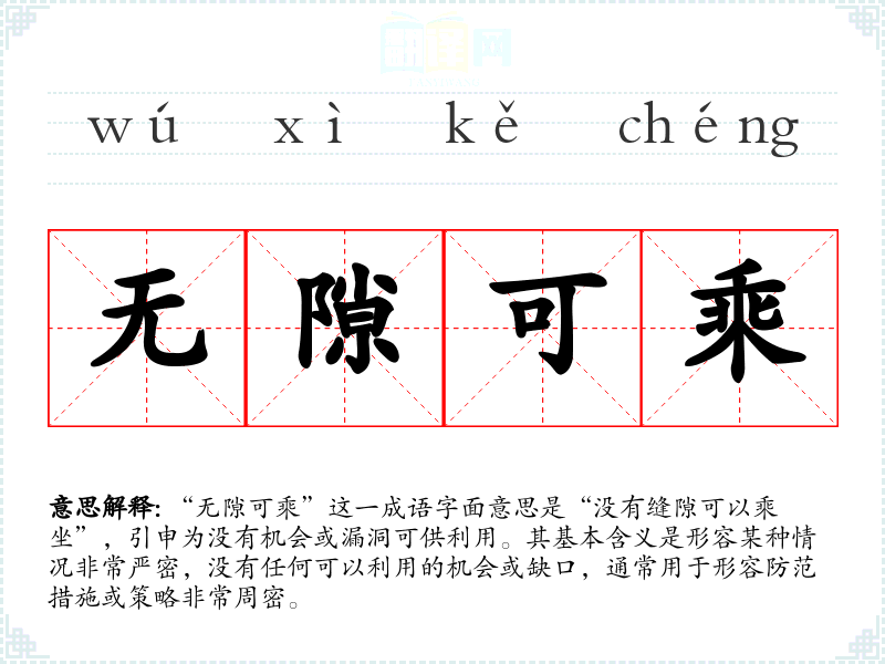 “无隙可乘”这一成语字面意思是“没有缝隙可以乘坐”,引申为没有机会或漏洞可供利用。其基本含义是形容某种情况非常严密,没有任何可以利用的机会或缺口,通常用于形容防范措施或策略非常周密。