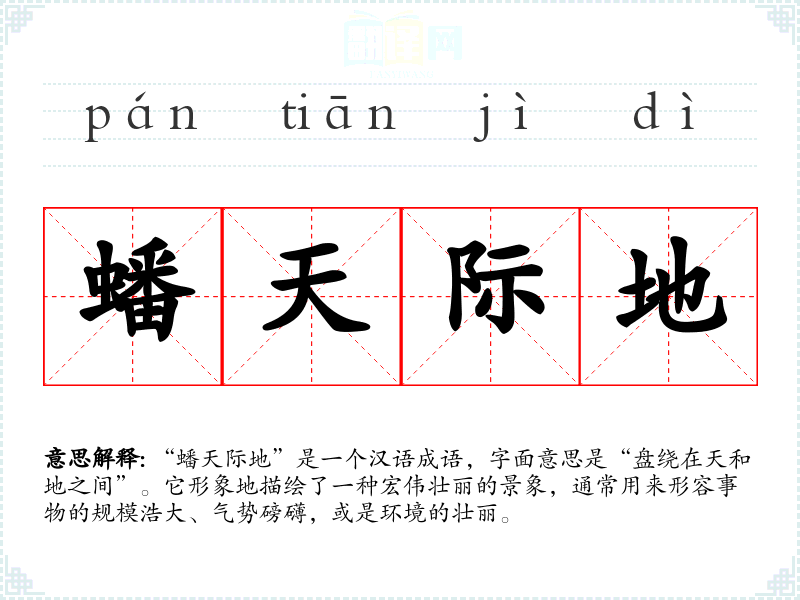 | 蟠天际地 | 蟠:遍及;际:到。指从天到地无所不在。形容气势博大。 |