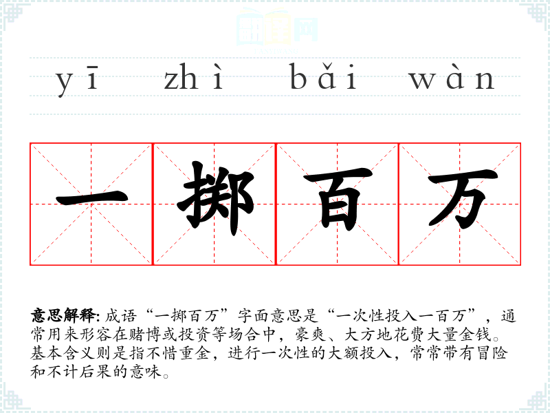 成语“一掷百万”字面意思是“一次性投入一百万”,通常用来形容在赌博或投资等场合中,豪爽、大方地花费大量金钱。基本含义则是指不惜重金,进行一次性的大额投入,常常带有冒险和不计后果的意味。