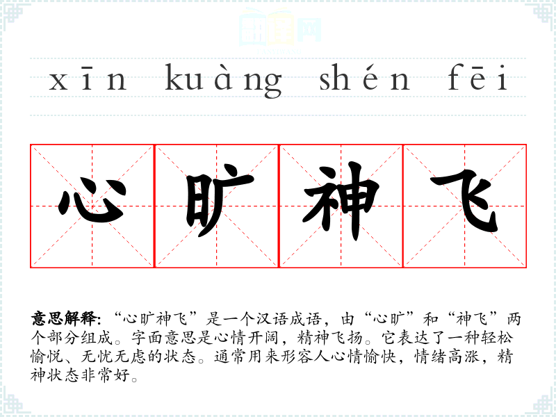 - 日常对话:可以用来形容一个人心情愉快,如“今天的天气真好,让我感觉心旷神飞。”