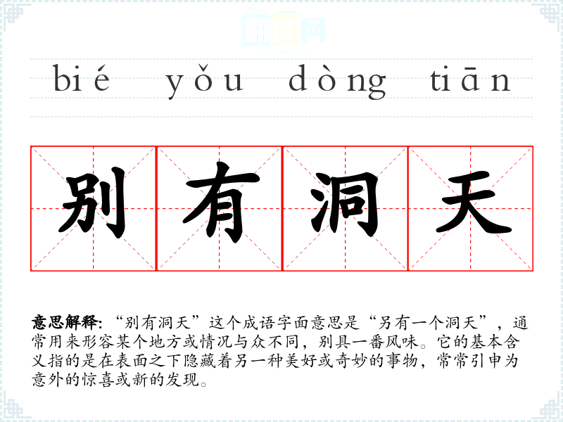 “别有洞天”这个成语字面意思是“另有一个洞天”,通常用来形容某个地方或情况与众不同,别具一番风味。它的基本含义指的是在表面之下隐藏着另一种美好或奇妙的事物,常常引申为意外的惊喜或新的发现。