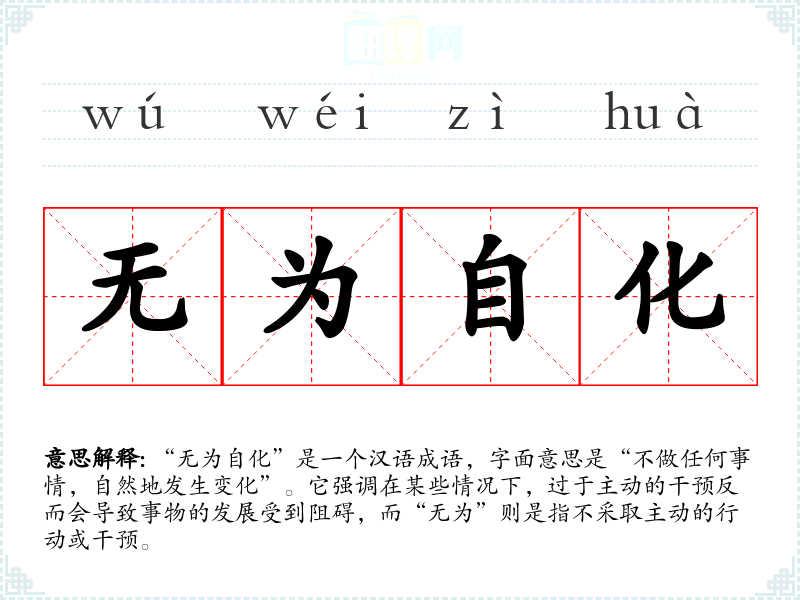 “无为自化”是一个汉语成语,字面意思是“不做任何事情,自然地发生变化”。它强调在某些情况下,过于主动的干预反而会导致事物的发展受到阻碍,而“无为”则是指不采取主动的行动或干预。