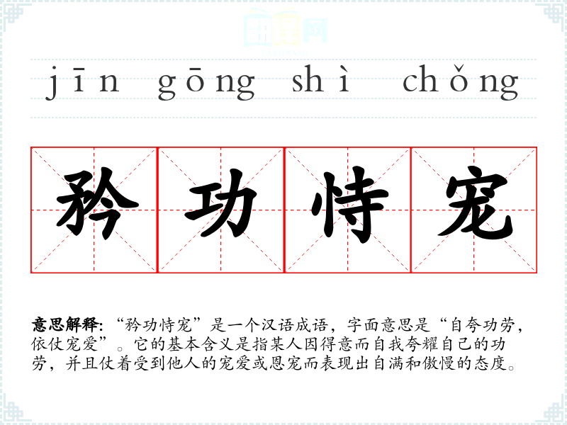 “矜功恃宠”是一个汉语成语,字面意思是“自夸功劳,依仗宠爱”。它的基本含义是指某人因得意而自我夸耀自己的功劳,并且仗着受到他人的宠爱或恩宠而表现出自满和傲慢的态度。