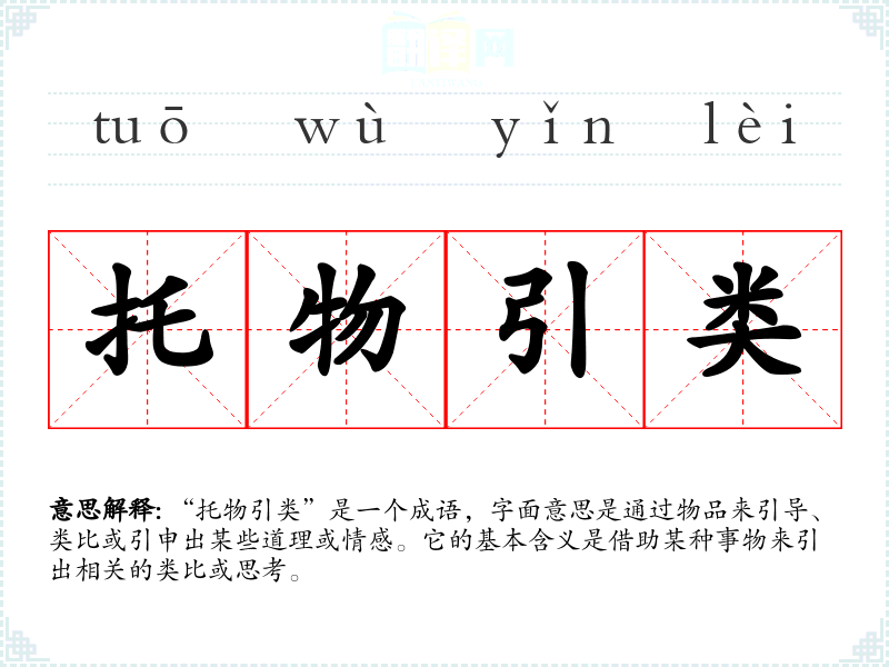 “托物引类”是一个成语,字面意思是通过物品来引导、类比或引申出某些道理或情感。它的基本含义是借助某种事物来引出相关的类比或思考。