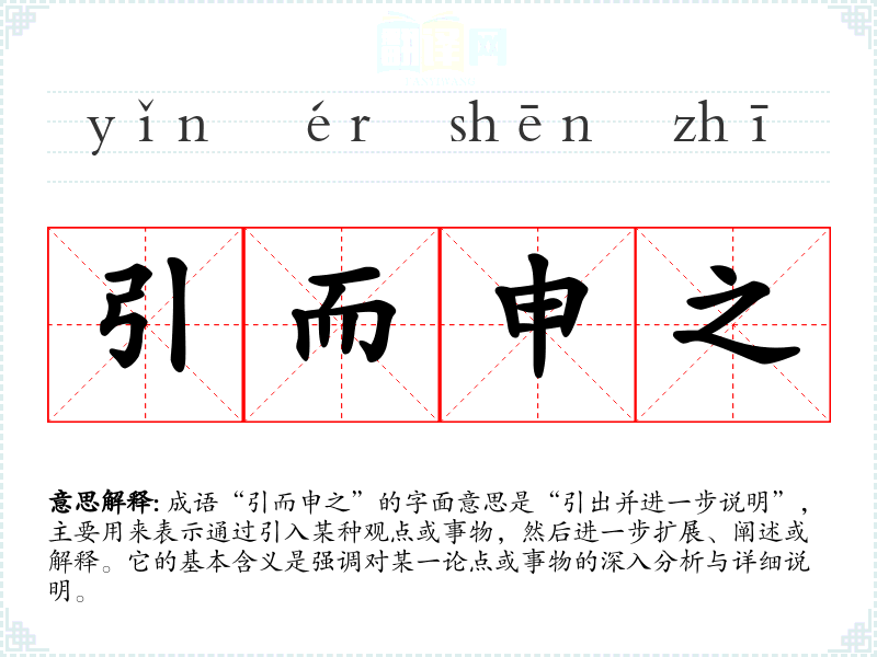 成语“引而申之”的字面意思是“引出并进一步说明”,主要用来表示通过引入某种观点或事物,然后进一步扩展、阐述或解释。它的基本含义是强调对某一论点或事物的深入分析与详细说明。