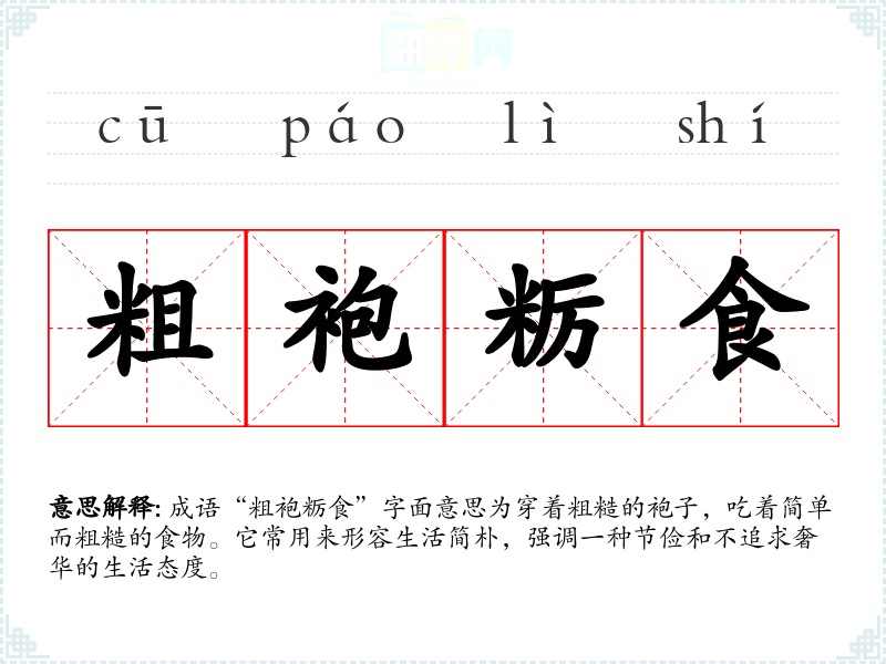 | 粗袍粝食 | 粗劣的衣食。形容生活俭朴。 |