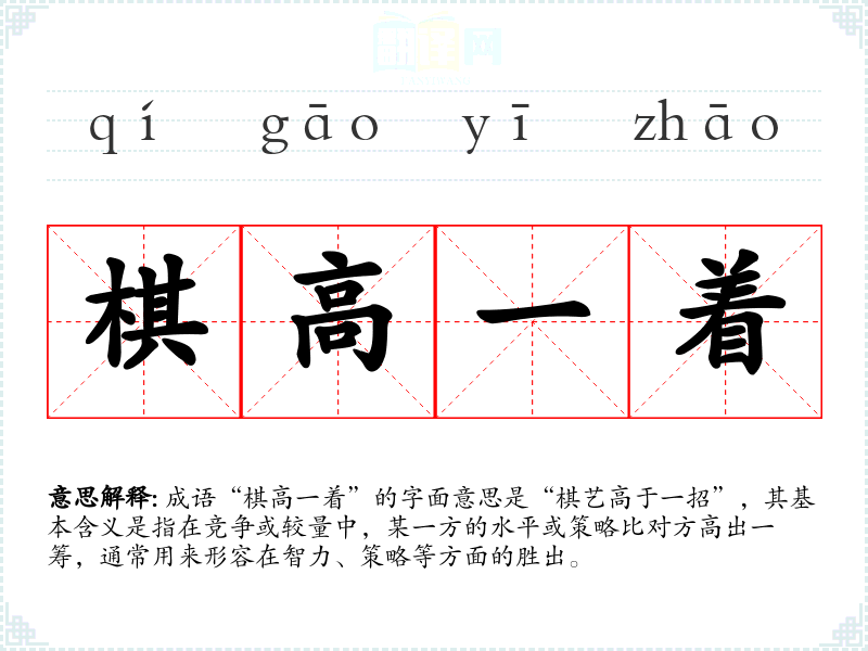 成语“棋高一着”的字面意思是“棋艺高于一招”,其基本含义是指在竞争或较量中,某一方的水平或策略比对方高出一筹,通常用来形容在智力、策略等方面的胜出。