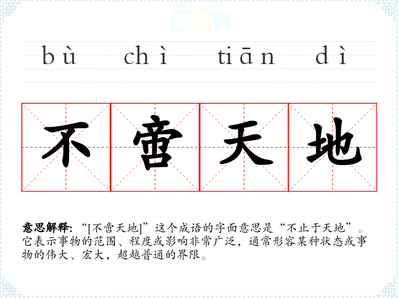 “[不啻天地]”这个成语的字面意思是“不止于天地”。它表示事物的范围、程度或影响非常广泛,通常形容某种状态或事物的伟大、宏大,超越普通的界限。