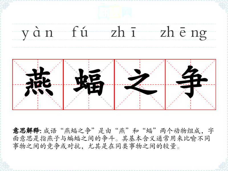 成语“燕蝠之争”是由“燕”和“蝠”两个动物组成,字面意思是指燕子与蝙蝠之间的争斗。其基本含义通常用来比喻不同事物之间的竞争或对抗,尤其是在同类事物之间的较量。