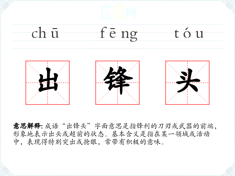 成语“出锋头”字面意思是指锋利的刀刃或武器的前端,形象地表示出头或超前的状态。基本含义是指在某一领域或活动中,表现得特别突出或抢眼,常带有积极的意味。