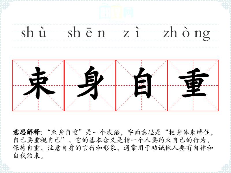 “束身自重”是一个成语,字面意思是“把身体束缚住,自己要重视自己”。它的基本含义是指一个人要约束自己的行为,保持自重,注意自身的言行和形象,通常用于劝诫他人要有自律和自我约束。