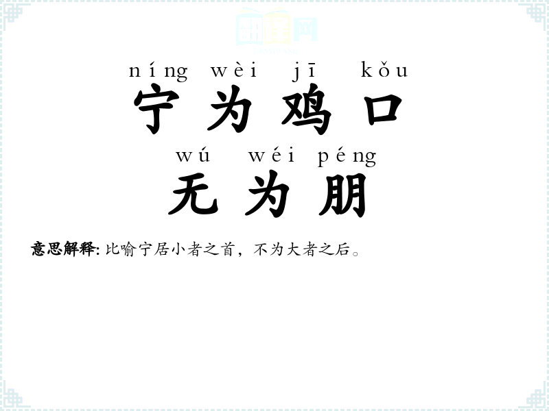 | 宁为鸡口,无为朋 | 比喻宁居小者之首,不为大者之后。 |