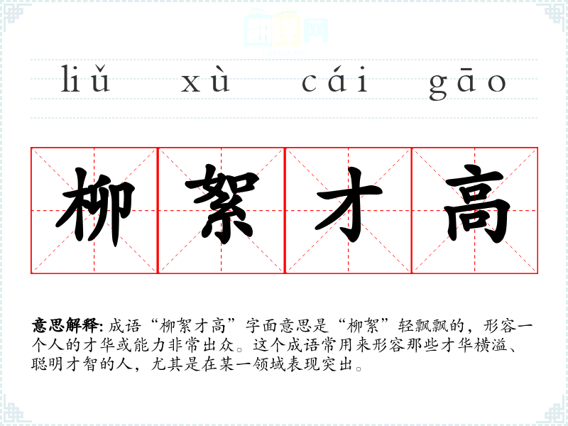 成语“柳絮才高”字面意思是“柳絮”轻飘飘的,形容一个人的才华或能力非常出众。这个成语常用来形容那些才华横溢、聪明才智的人,尤其是在某一领域表现突出。