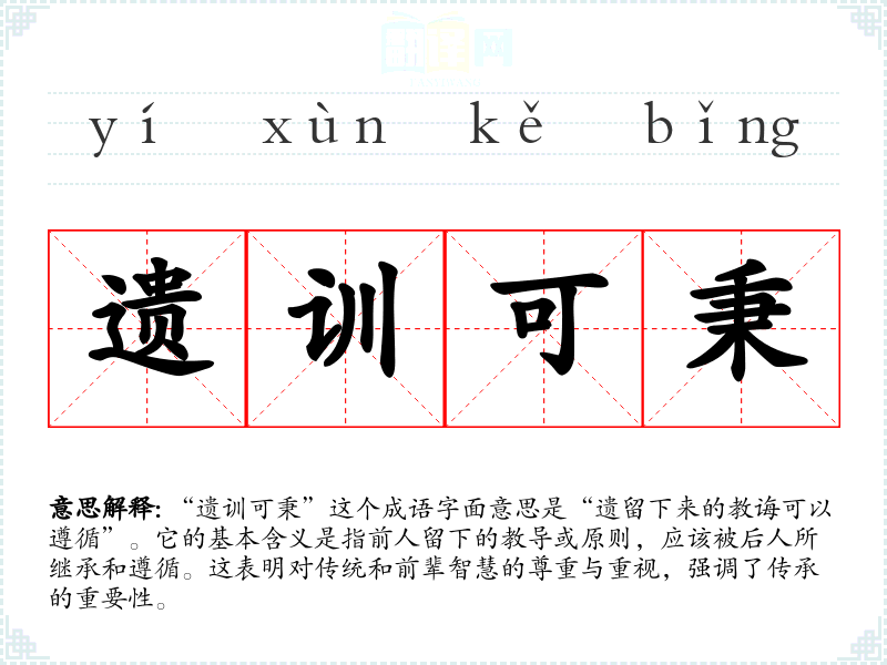 “遗训可秉”这个成语字面意思是“遗留下来的教诲可以遵循”。它的基本含义是指前人留下的教导或原则,应该被后人所继承和遵循。这表明对传统和前辈智慧的尊重与重视,强调了传承的重要性。