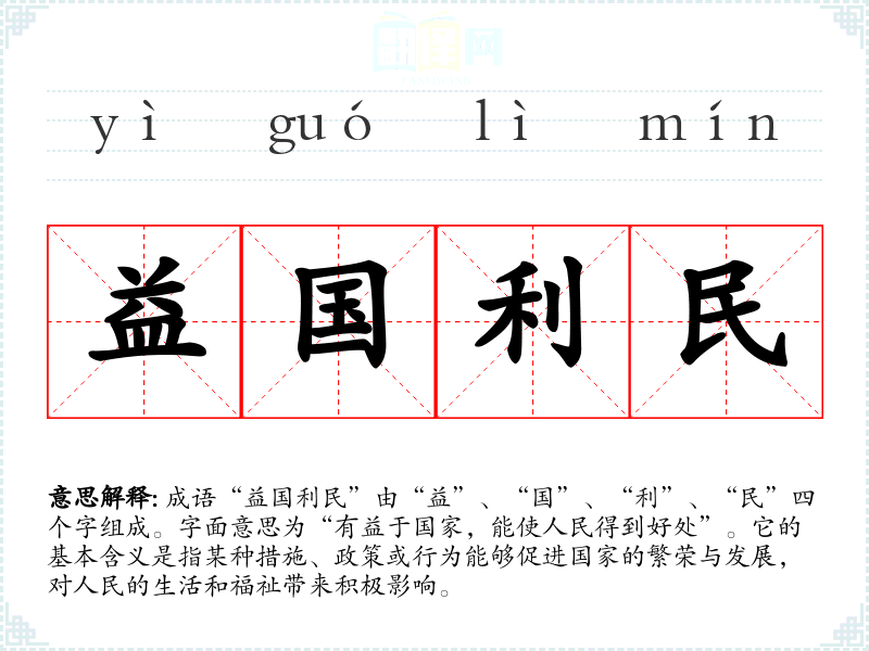 成语“益国利民”由“益”、“国”、“利”、“民”四个字组成。字面意思为“有益于国家,能使人民得到好处”。它的基本含义是指某种措施、政策或行为能够促进国家的繁荣与发展,对人民的生活和福祉带来积极影响。