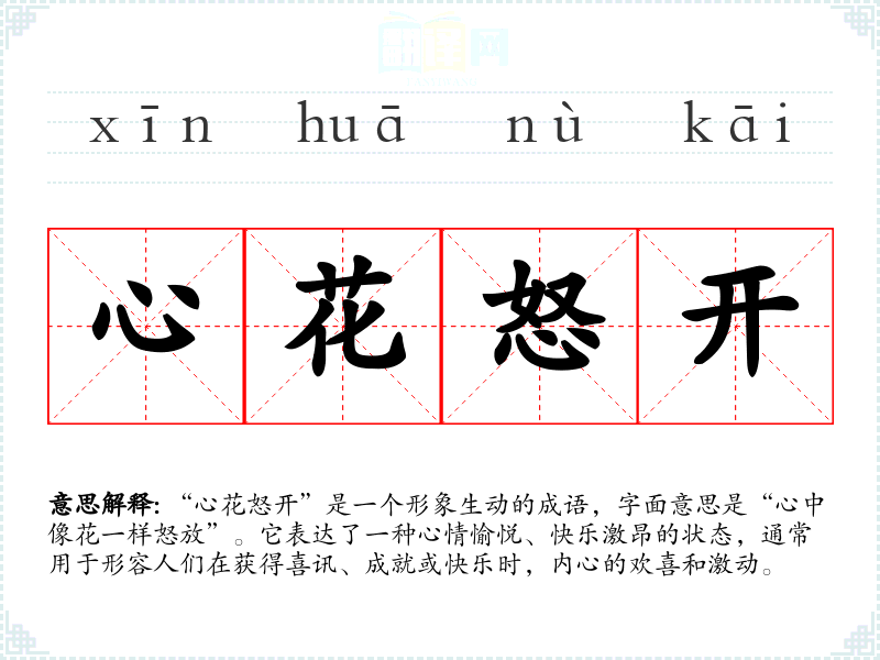 “心花怒开”反映了**传统文化中对情感表达的重视。在现代社会,虽然人们的生活节奏加快,但对快乐和幸福的追求仍然是人们生活的重要组成部分。这个成语在现代依然适用,能够有效传达积极的情感。