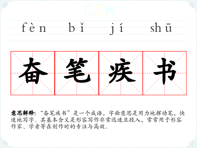 “奋笔疾书”是一个成语,字面意思是用力地挥动笔,快速地写字。其基本含义是形容写作非常迅速且投入,常常用于形容作家、学者等在创作时的专注与高效。