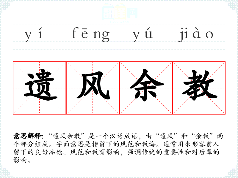 通过对“遗风余教”的学,我深刻体会到文化传承的重要性。它不仅丰富了我的语言表达,也让我更加珍视家族的历史和教育的价值。在今后的学和生活中,我将继续关注传统文化,努力将“遗风余教”融入我的实际行为中。