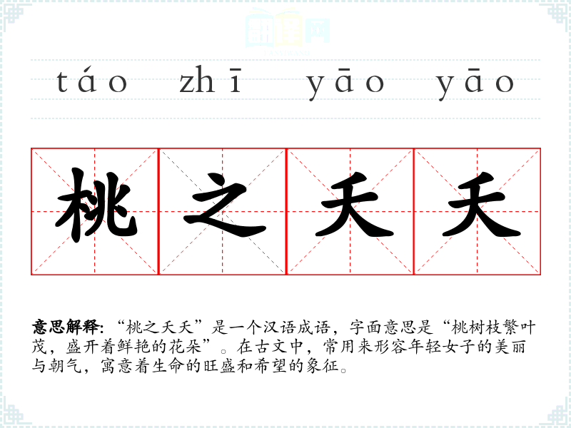 “桃之夭夭”是一个汉语成语,字面意思是“桃树枝繁叶茂,盛开着鲜艳的花朵”。在古文中,常用来形容年轻女子的美丽与朝气,寓意着生命的旺盛和希望的象征。