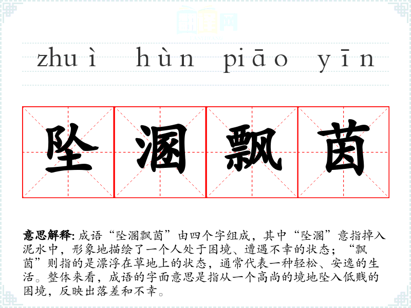 - 同义成语:堕落、沉沦、身陷泥淖等,均表达了从高处跌落到低处的状态,但“坠溷飘茵”更强调了精神上的失落与无奈。