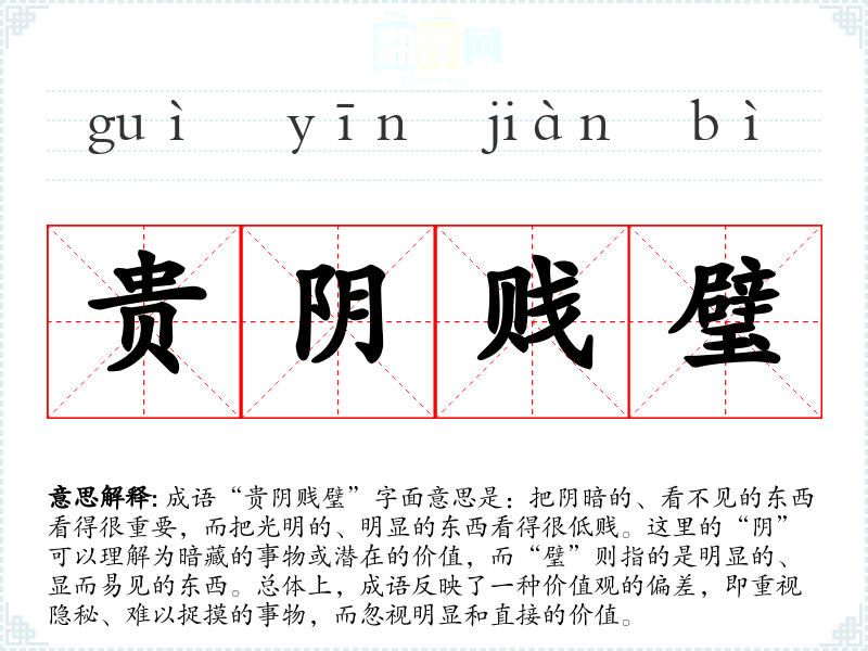 成语“贵阴贱璧”字面意思是:把阴暗的、看不见的东西看得很重要,而把光明的、明显的东西看得很低贱。这里的“阴”可以理解为暗藏的事物或潜在的价值,而“璧”则指的是明显的、显而易见的东西。总体上,成语反映了一种价值观的偏差,即重视隐秘、难以捉摸的事物,而忽视明显和直接的价值。
