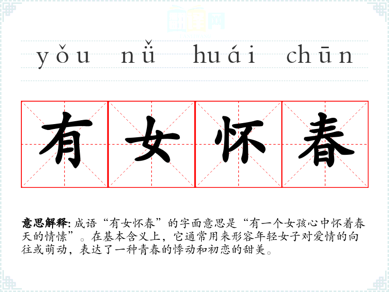 成语“有女怀春”的字面意思是“有一个女孩心中怀着春天的情愫”。在基本含义上,它通常用来形容年轻女子对爱情的向往或萌动,表达了一种青春的悸动和初恋的甜美。