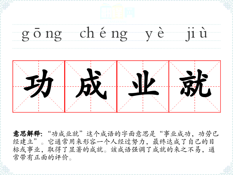 “功成业就”这个成语的字面意思是“事业成功,功劳已经建立”。它通常用来形容一个人经过努力,最终达成了自己的目标或事业,取得了显著的成就。该成语强调了成就的来之不易,通常带有正面的评价。
