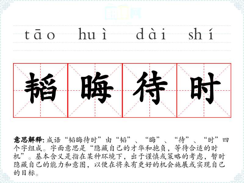 成语“韬晦待时”由“韬”、“晦”、“待”、“时”四个字组成。字面意思是“隐藏自己的才华和抱负,等待合适的时机”。基本含义是指在某种环境下,出于谨慎或策略的考虑,暂时隐藏自己的能力和意图,以便在将来有更好的机会施展或实现自己的目标。