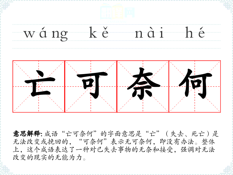 成语“亡可奈何”的字面意思是“亡”(失去、死亡)是无法改变或挽回的,“可奈何”表示无可奈何,即没有办法。整体上,这个成语表达了一种对已失去事物的无奈和接受,强调对无法改变的现实的无能为力。
