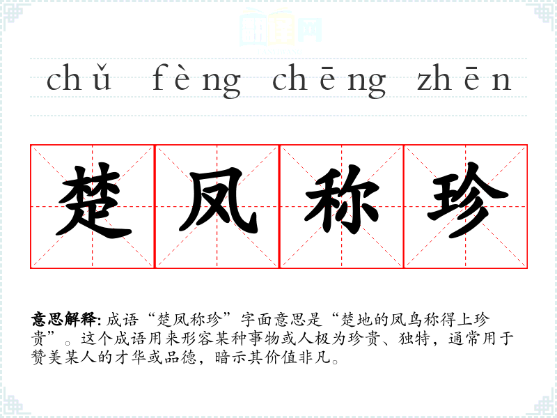 成语“楚凤称珍”字面意思是“楚地的凤鸟称得上珍贵”。这个成语用来形容某种事物或人极为珍贵、独特,通常用于赞美某人的才华或品德,暗示其价值非凡。