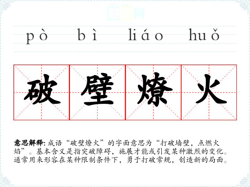 成语“破壁燎火”的字面意思为“打破墙壁,点燃火焰”。基本含义是指突破障碍,施展才能或引发某种激烈的变化。通常用来形容在某种限制条件下,勇于打破常规,创造新的局面。