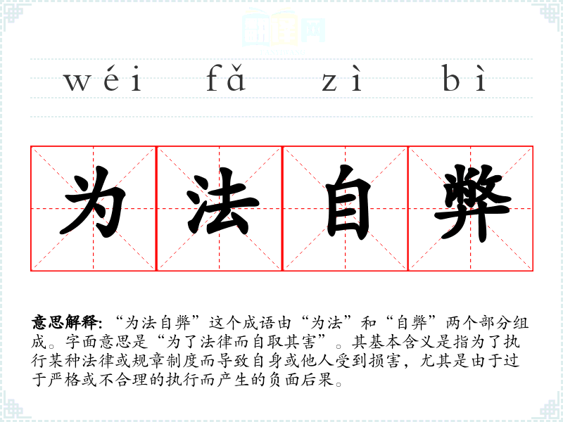 “为法自弊”这个成语由“为法”和“自弊”两个部分组成。字面意思是“为了法律而自取其害”。其基本含义是指为了执行某种法律或规章制度而导致自身或他人受到损害,尤其是由于过于严格或不合理的执行而产生的负面后果。