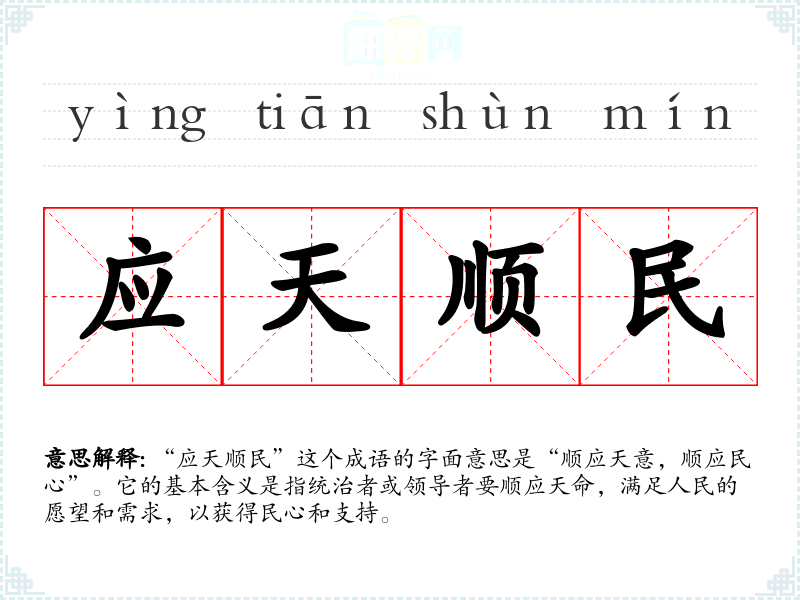 “应天顺民”这个成语的字面意思是“顺应天意,顺应民心”。它的基本含义是指统治者或领导者要顺应天命,满足人民的愿望和需求,以获得民心和支持。