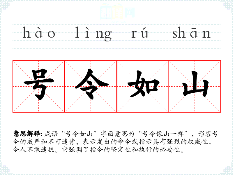 “号令如山”给人一种威严和坚定的感觉,联想到军队的纪律性和领导者的果敢决策。在表达时,能够传达出一种强烈的责任感和使命感。