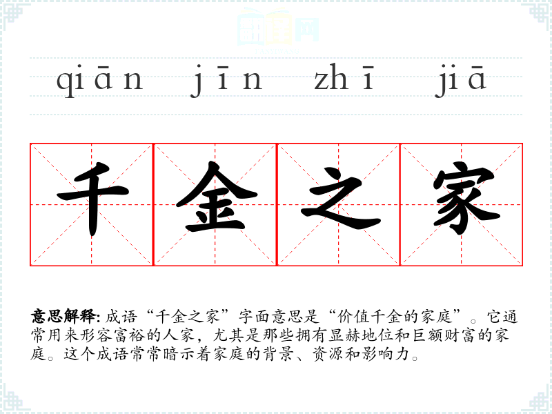 成语“千金之家”字面意思是“价值千金的家庭”。它通常用来形容富裕的人家,尤其是那些拥有显赫地位和巨额财富的家庭。这个成语常常暗示着家庭的背景、资源和影响力。