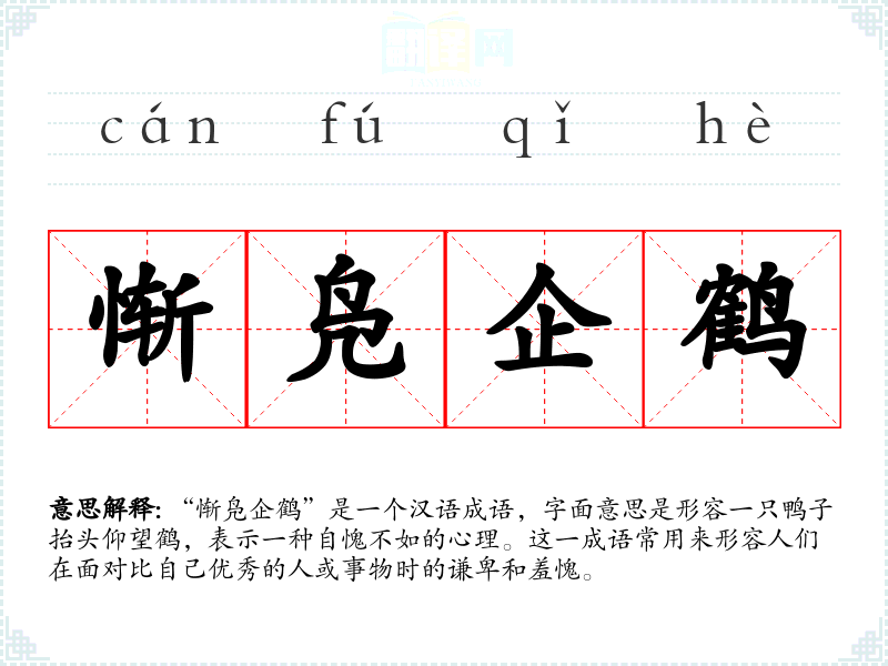 “惭凫企鹤”是一个汉语成语,字面意思是形容一只鸭子抬头仰望鹤,表示一种自愧不如的心理。这一成语常用来形容人们在面对比自己优秀的人或事物时的谦卑和羞愧。