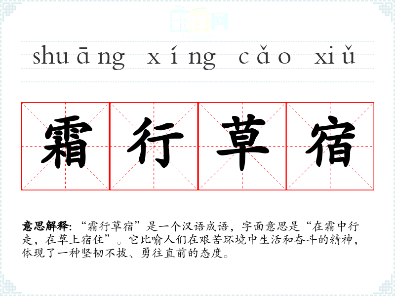 “霜行草宿”是一个汉语成语,字面意思是“在霜中行走,在草上宿住”。它比喻人们在艰苦环境中生活和奋斗的精神,体现了一种坚韧不拔、勇往直前的态度。