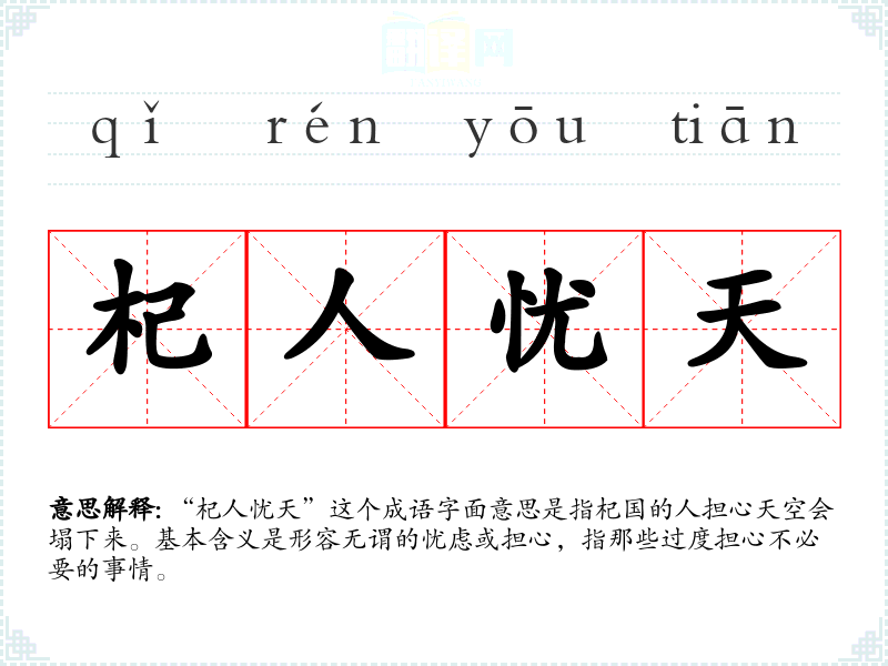 “杞人忧天”这个成语字面意思是指杞国的人担心天空会塌下来。基本含义是形容无谓的忧虑或担心,指那些过度担心不必要的事情。